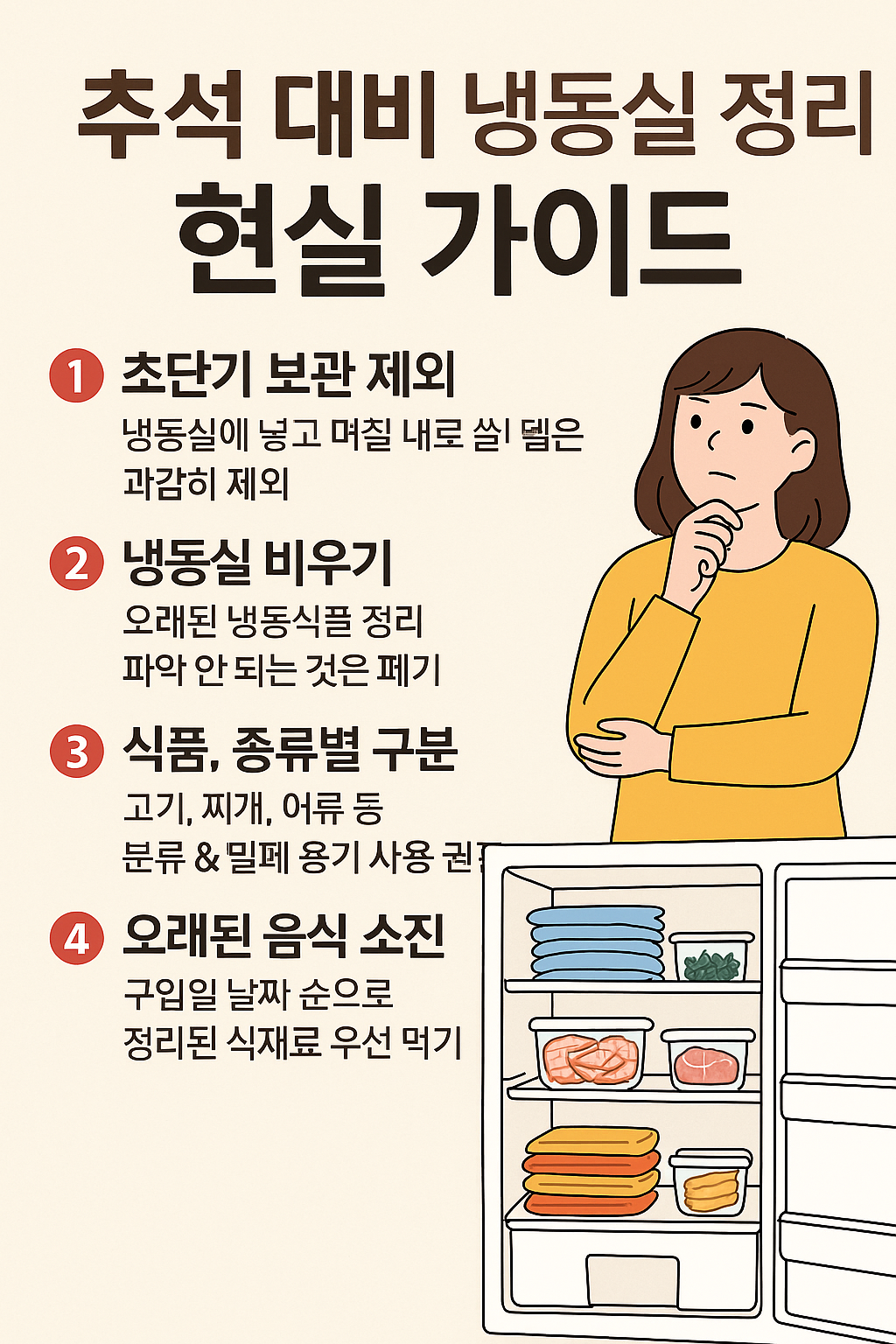 추석 직전 냉동실을 비우지 않으면, 연휴 끝에 남은 전·고기·국물이 뒤엉켜 상하거나 버리는 일이 생깁니다. 감성보다 보관 안전·공간 효율·폐기 최소화가 우선입니다. 아래는 미화 없는 현실 체크리스트입니다.